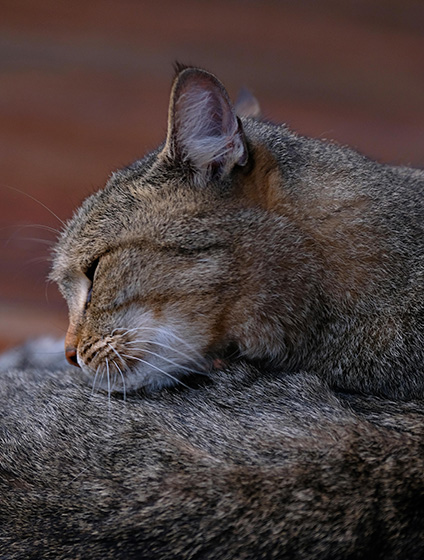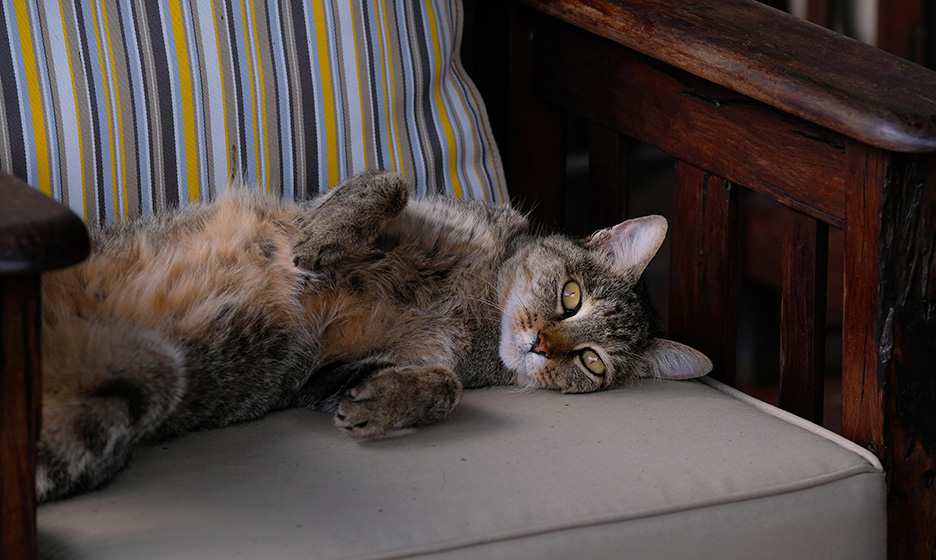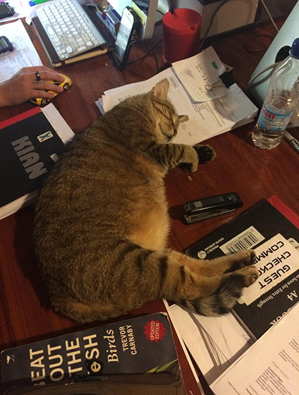 Simba, maybe not quite as large and obvious to the eye as Basil, but she was indeed robust and had a large personality that more than made up for it. She would often sit with us in the office, either lounging on the desks, or parading over keyboards on her way to the door and out into the lodge. She was also often to be seen on the dining deck weaving between the table legs during mealtimes. Perhaps our longest standing furry member of the family; Simba was adopted into our family all the way back in Livingstone in 2002, just about the time I (Lara) was born. So she grew up alongside me, my sisters, and the lodge for many a year. She unfortunately passed away in 2018.
